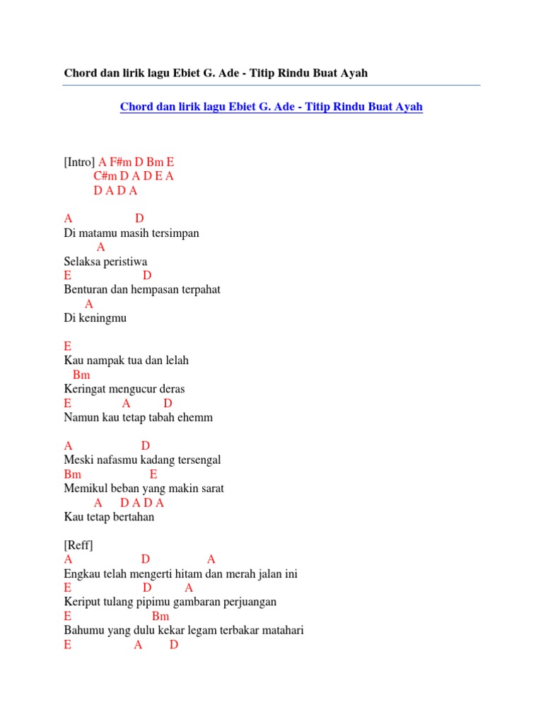 Lirik Lagu Ebiet G Ade Titip Rindu Buat Ayah Dimatamu masih tersimpan selaksa peristiwa Benturan dan hempasan terpahat dikeningmu Kau nampak tua dan lelah keringat mengucur deras Namun kau tetap tabah hm Meski nafasmu kadang tersengal Memikul beban yang makin sarat Kau tetap bertahan. Chord dan Lirik Lagu Titip Rindu Buat Ayah - Ebiet G Ade Kunci C Ayah Dalam Hening Sepi Kurindu Chord dan lirik lagu Titip Rindu Buat Ayah - Ebiet G Ade versi mudah kunci C.