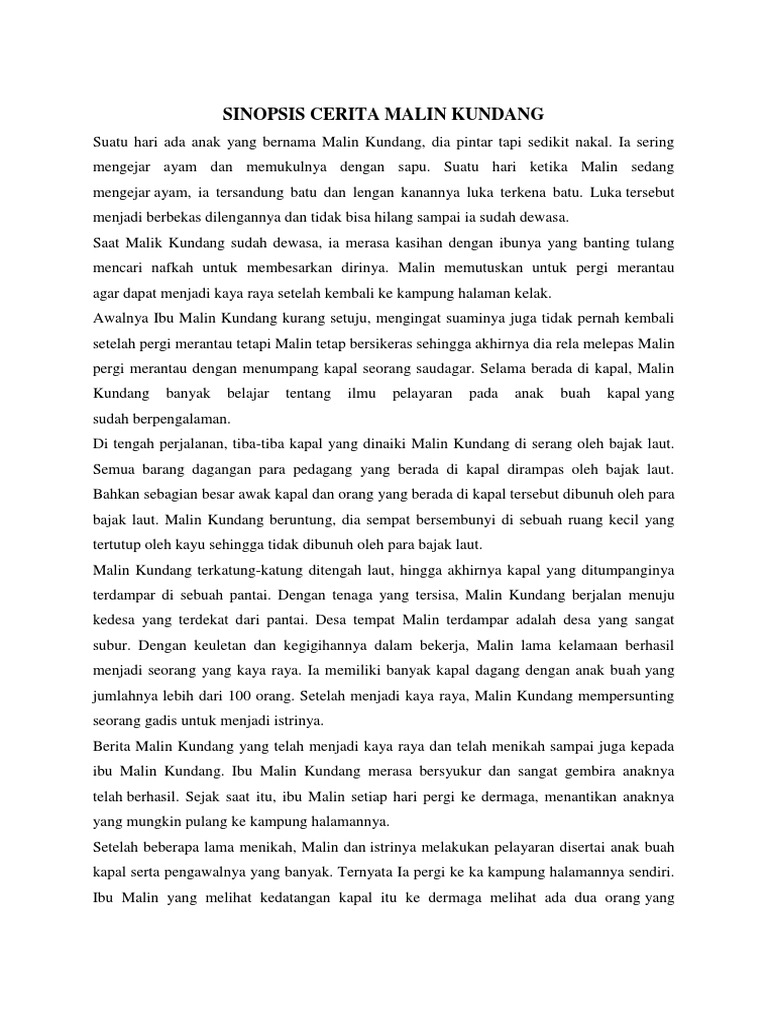 Sinopsis malin kundang - Free download as Word Doc doc docx PDF File pdf Text File txt or read online for free. Cerita legenda rakyat yang sangat terkenal di Indonesia salah satunya adalah Malin Kundang. Buku Cerita Asli Indonesia.
