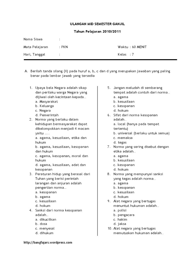 Kunci Jawaban Soal Latihan Ulangan PASUAS PKn Kelas 7 SMP Semester 1 Tahun 2020 Berikut ini jawaban dan soal untuk latihan Penilaian Akhir Semester PAS atau Ulangan Akhir Semester UAS Kelas 7. Kali ini kami menyajikan tullisan yang berjudul Download Soal Siap UTS PKn Kelas XI SMA Semester 1 Terbaru di mana di dalamnya berisi contoh soal yang berjumlah 50 butir dan bisa Anda jadikan media berlatih dan belajar khusus mapel PKnKami juga akan secara bertahap menyajikan berbagai contoh soal UTS 1 mapel kelas XI 11 SMA yang lainnya. Beranda soal ujian matematika kelas 7 semester 1.